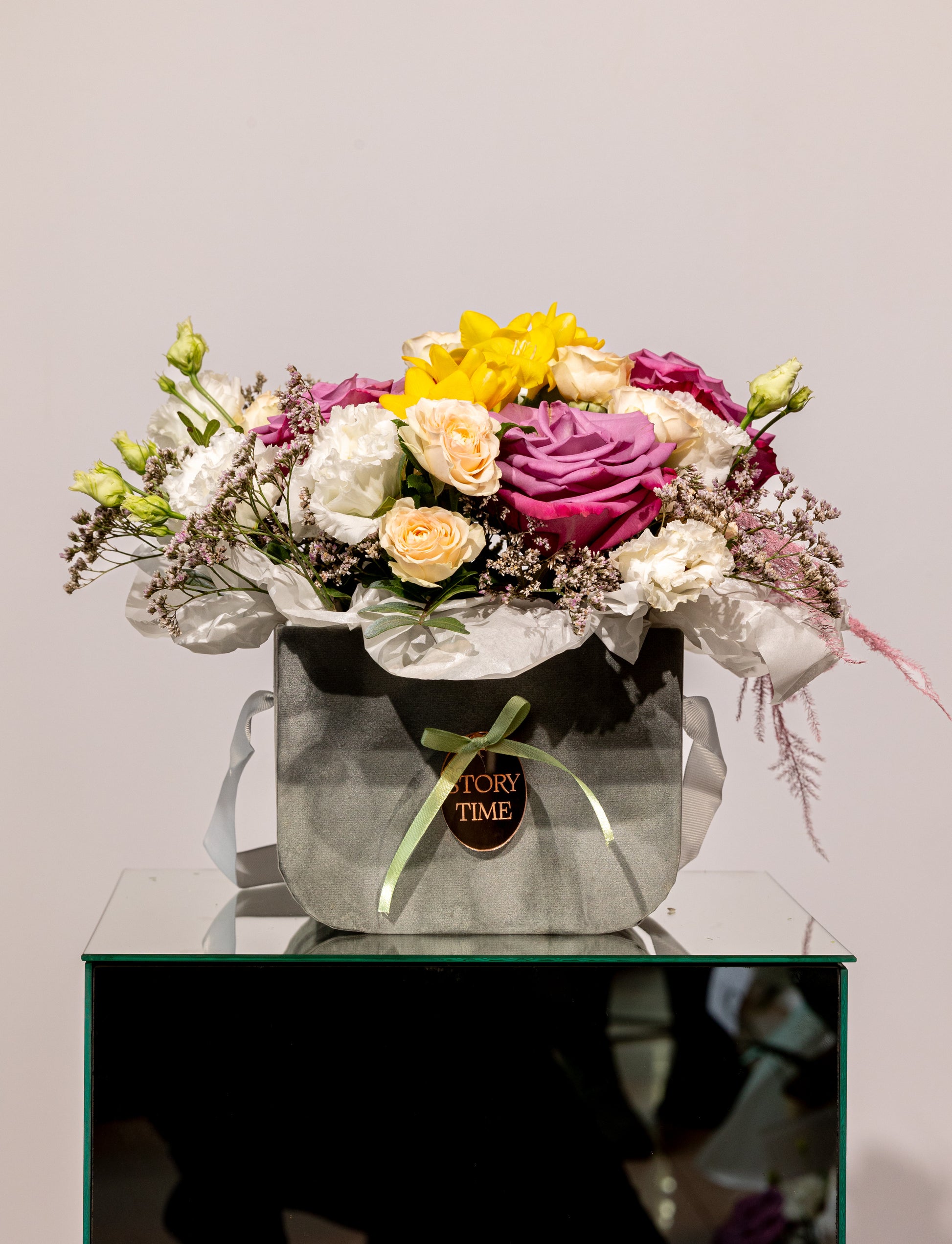Un aranjament vibrant și sofisticat, care combină tonurile intense de mov cu accente delicate de alb și pastel. Trandafirii mov, freziile și minirosa se îmbină armonios cu eustoma și verdeața proaspătă, creând o compoziție plină de viață și rafinament.