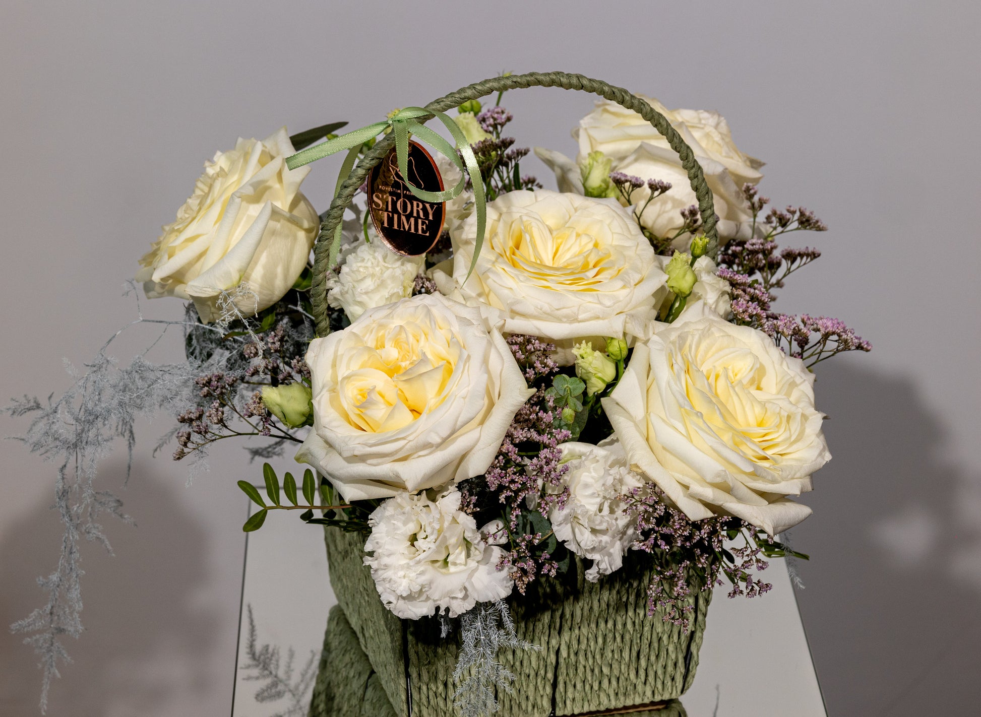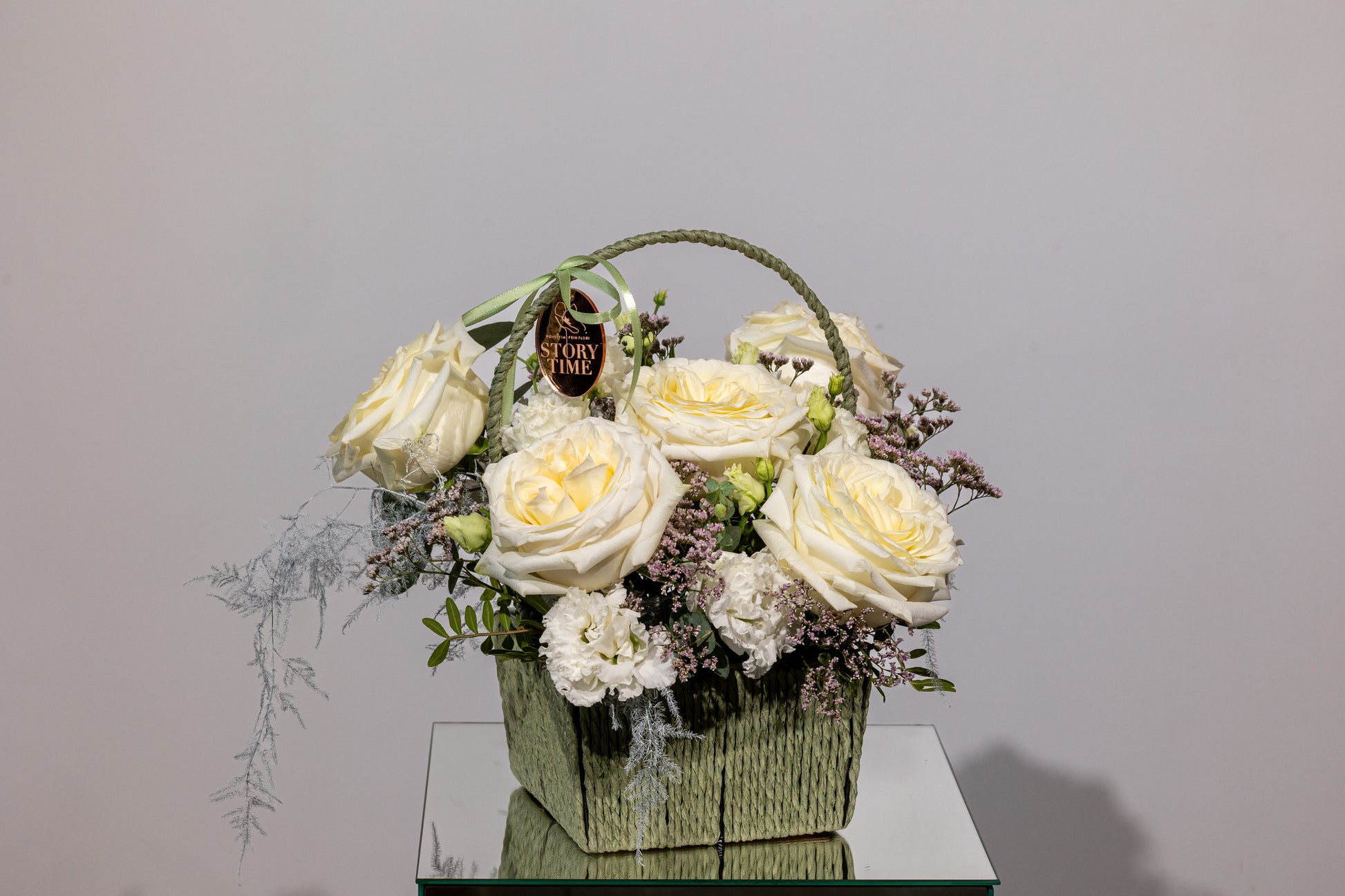 Un aranjament delicat și luminos, creat pentru a transmite sinceritate și armonie. Trandafirii albi, alături de accentele fine de eustoma și limonium, compun o expresie rafinată a purității și eleganței naturale.