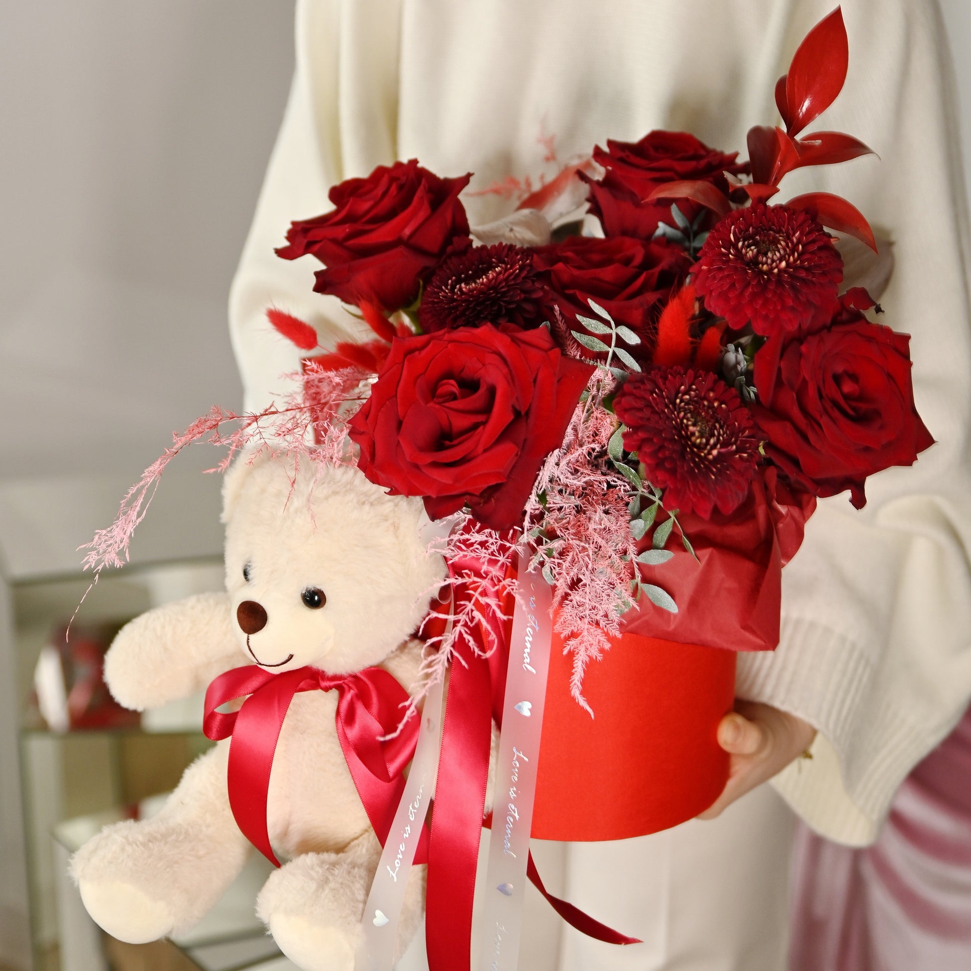 - 5 trandafiri rosii, 3 gerbera, asparagus, ruscus,ursulet de plus