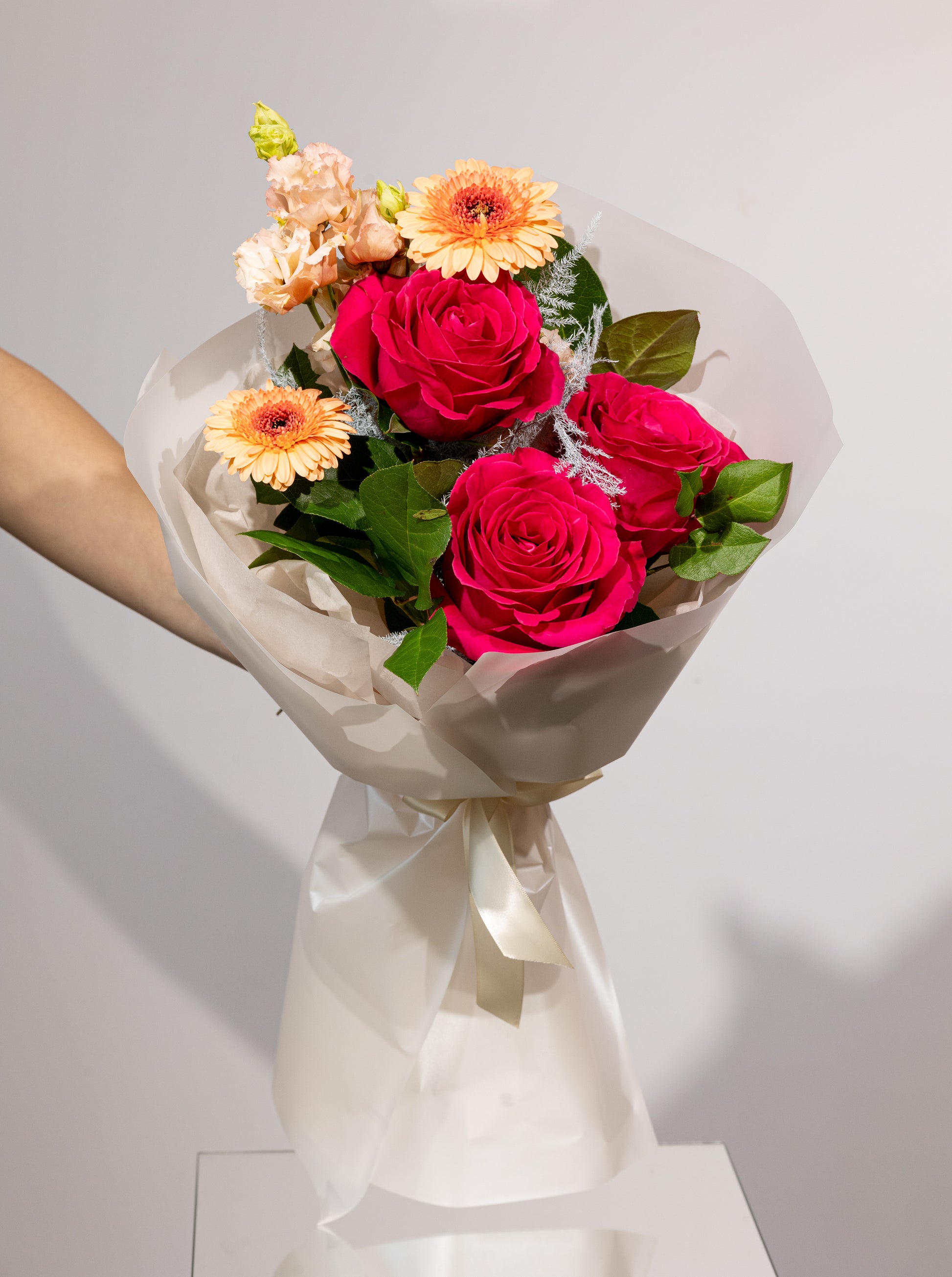 Un buchet vibrant și plin de personalitate, creat pentru a aduce energie și bucurie în orice moment. Nuanțele intense de fucsia și accentele delicate oferă un contrast armonios, perfect pentru a exprima emoții autentice.