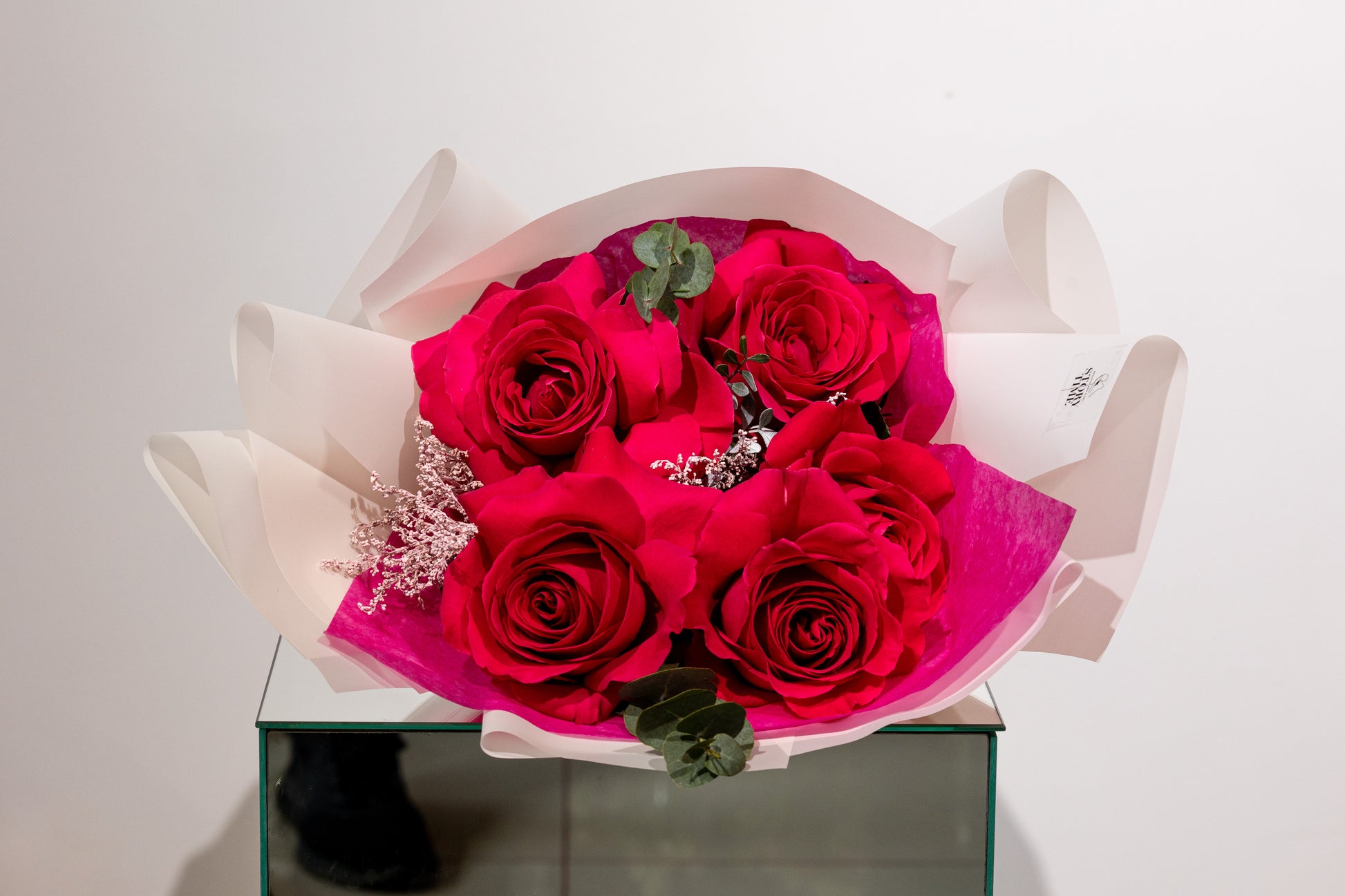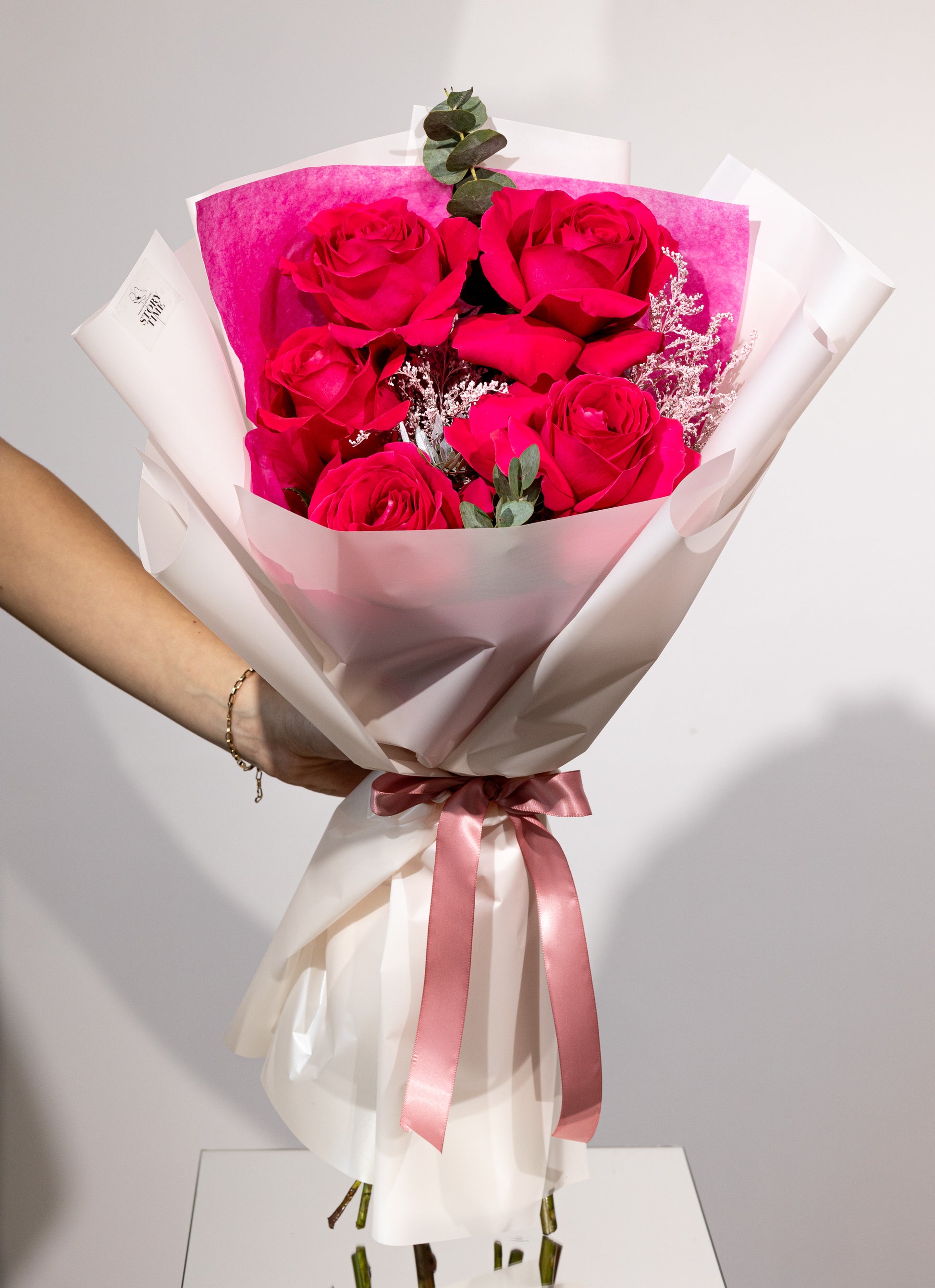 Un buchet simplu și expresiv, care transmite emoții autentice prin frumusețea pură a trandafirilor cyclam. Eleganța florilor este completată de verdeața proaspătă și accesoriile florale, rezultând o compoziție armonioasă și rafinată.