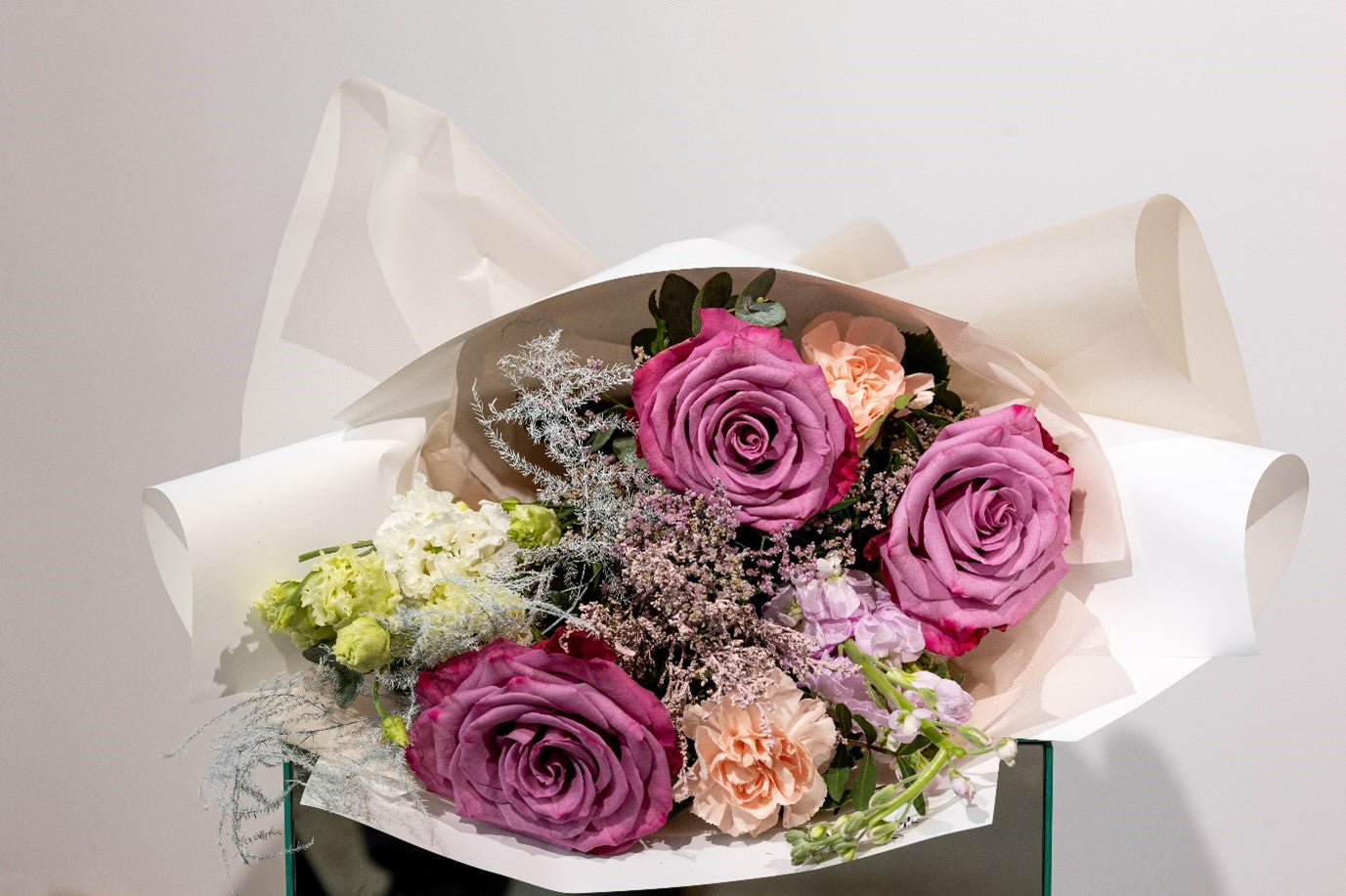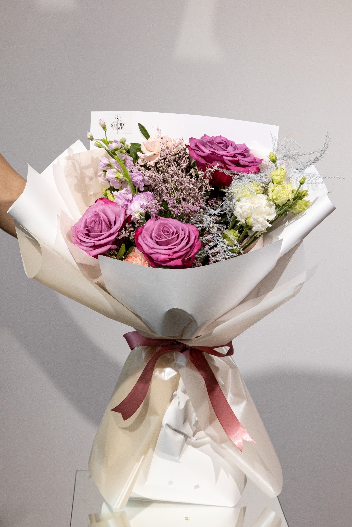 Un buchet delicat și plin de rafinament, care îmbină armonios trandafirii cu accente de mathiola, eustoma și garoafe. Limonium-ul și asparagus-ul adaugă textură, iar verdeața proaspătă și accesoriile florale completează compoziția, creând un efect elegant și armonios.