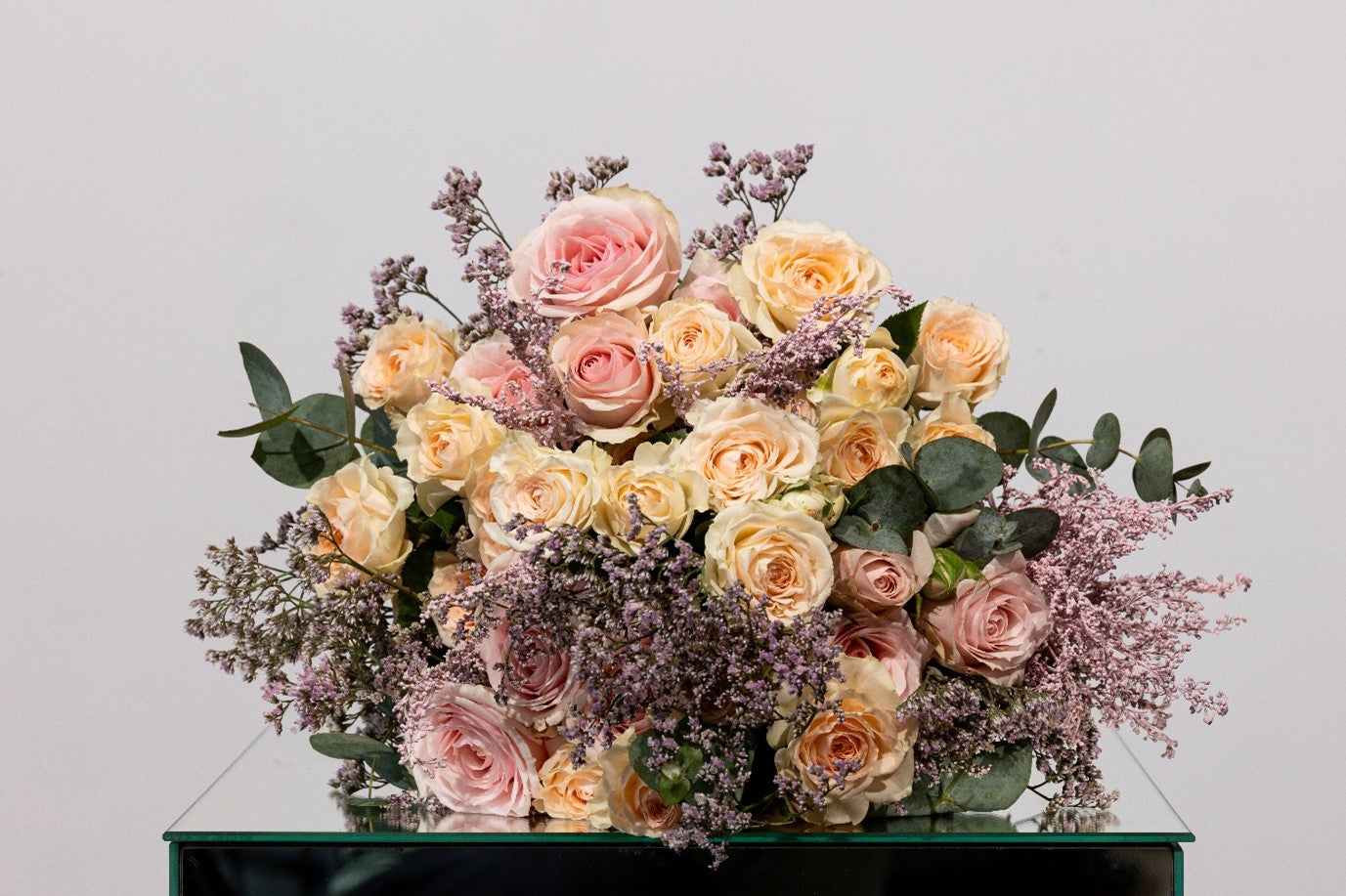 Un buchet delicat și expresiv, perfect pentru a transmite scuze sau gesturi de atenție prin frumusețea minirosei. Accentele de solidago, limonium și verdeața proaspătă, împreună cu accesoriile florale, creează o compoziție armonioasă și elegantă.