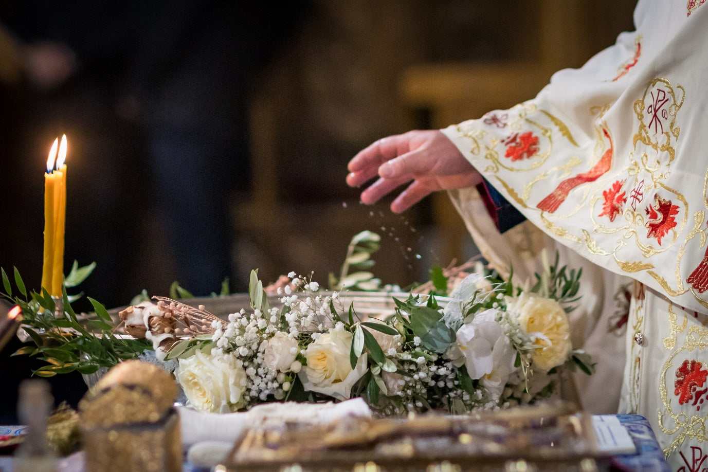 Accentele florale albe, alese cu grijă, aduc un aer îngeresc, punând în valoare frumusețea momentului în care micuța este binecuvântată. Texturile trandafirilor candlelight, orhideea phalaenopsis, minirose, Eustoma, bumbacelul, eucalyptul si frunzele de maslin creează un decor armonios, perfect pentru o fetiță: luminos, curat și plin de tandrețe