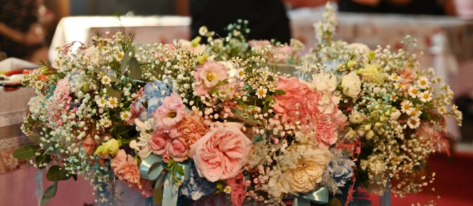 Un aranjament floral deosebit, creat special pentru decorarea cristelniței în cadrul ceremoniei de botez. Cu flori în tonuri pastelate de roz și albastru, acest decor aduce o notă jucăușă, dar elegantă, perfectă pentru celebrarea unui moment atât de special.